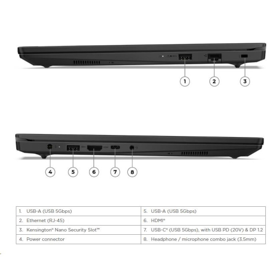 | Standardní porty | 2x USB-A (USB 5Gbps / USB 3.2 Gen 1) 1x USB-C® (USB 5Gbps / USB 3.2 Gen 1), with USB Power Delivery (20V only) and DisplayPort™ 1.2 1x HDMI® 1.4b 1x Headphone / microphone combo jack (3.5mm) 1x Ethernet (RJ-45) 1x Power connector |