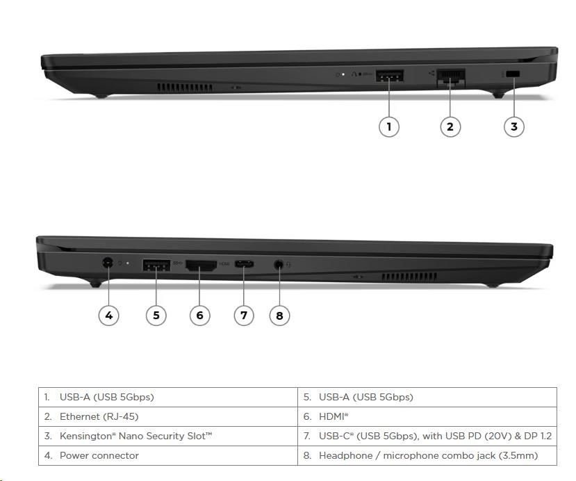 | Štandardné porty | 2x USB-A (USB 5Gbps / USB 3.2 Gen 1) 1x USB-C® (USB 5Gbps / USB 3.2 Gen 1), s USB Power Delivery (len 20V) a DisplayPort™ 1.2 1x HDMI® 1.4b 1x Combo jack slúchadlá / mikrofón (3.5mm) 1x Ethernet (RJ-45) 1x Napájací konektor |