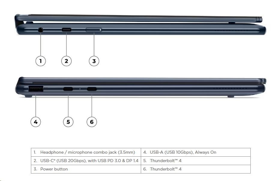 | Standartné porty | 1x USB-A (USB 10Gbps / USB 3.2 Gen 2), Always On 1x USB-C® (USB 20Gbps / USB4® Gen 2x2), with USB PD 3.0 and DisplayPort™ 1.4 2x USB-C® (Thunderbolt™ 4 / USB4® 40Gbps), with USB PD 3.0 and DisplayPort™ 2.1 1x Headphone / microphone combo jack (3.5mm) |