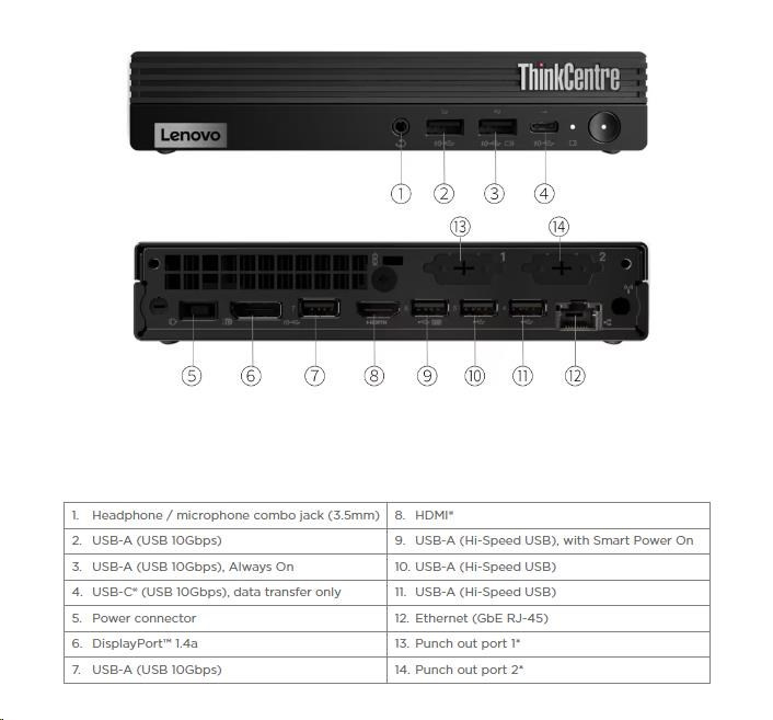 | Predné porty | 1x USB-C® (USB 10Gbps / USB 3.2 Gen 2), data transfer only 1x USB-A (USB 10Gbps / USB 3.2 Gen 2), with Always On and 5V@2.1A charging 1x USB-A (USB 10Gbps / USB 3.2 Gen 2) 1x headphone / microphone combo jack (3.5mm) |