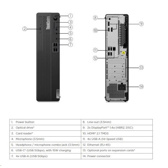 | Predné porty | 1x USB-C® (USB 5Gbps / USB 3.2 Gen 1), with 15W charging 4x USB-A (USB 5Gbps / USB 3.2 Gen 1) 1x headphone (3.5mm) 1x headphone / microphone combo jack (3.5mm) |