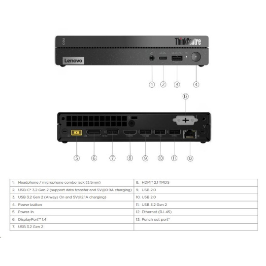 | Predné porty | 1x USB-C® 3.2 Gen 2 (support data transfer and 5V@0.9A charging) 1x USB 3.2 Gen 2 (Always On and 5V@2.1A charging) 1x headphone / microphone combo jack (3.5mm) |