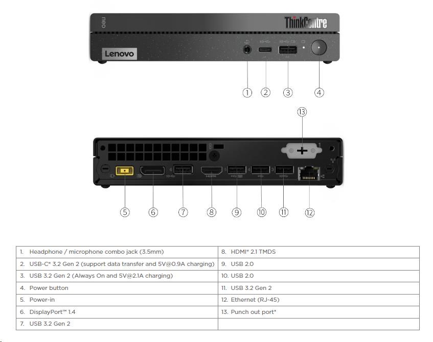 | Predné porty | 1x USB-C® 3.2 Gen 2 (support data transfer and 5V@0.9A charging) 1x USB 3.2 Gen 2 (Always On and 5V@2.1A charging) 1x headphone / microphone combo jack (3.5mm) |