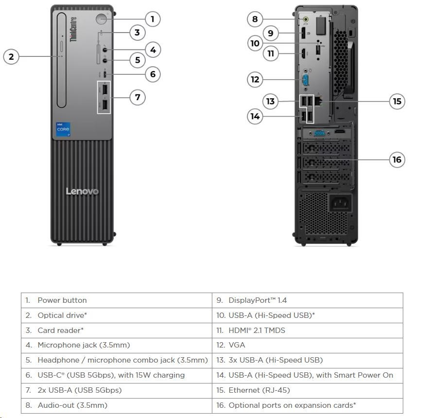 | Predné porty | 1x USB-C® (USB 5Gbps / USB 3.2 Gen 1), with 15W charging 2x USB-A (USB 5Gbps / USB 3.2 Gen 1) 1x headphone / microphone combo jack (3.5mm) 1x microphone (3.5mm) |