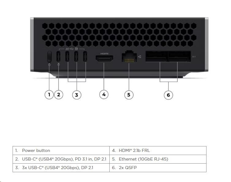| Zadné porty | 1x USB-C® (USB 20Gbps / USB4®), with USB PD 3.1 in and DisplayPort™ 2.1 2x QSFP (200Gbps each, for connecting two ThinkStation® PGX units) 3x USB-C® (USB4® 20Gbps), with DisplayPort™ 2.1 1x HDMI® 1x Ethernet (10GbE RJ-45) |