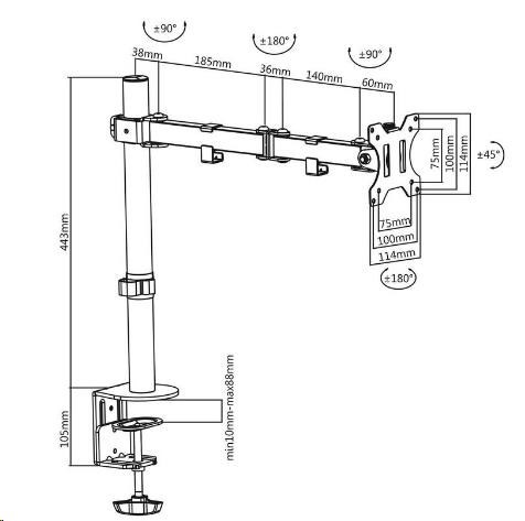 Levný kvalitný stolný držiak monitora Fiber Novelty F10 Otočný, sklopný, výškovo aj dĺžkovo nastaviteľný držiak monitora 13-32", funkcia PIVOT, 2 typy uchytenia na stolovú dosku, nosnosť 8kg Levný, predsa kvalitný stolný držiak na uchytenie LCD LED OLED monitoru s uhlopriečkou 13 až 32 palcov. Po uchytení monitoru na držiak oceníte zväčšený priestor na stole, monitor navyše môžete podľa ľubovôle otáčať do strán, nakláňať, vysúvať a aj výškovo nastavovať, monitor je možné rotovať pre horizontálne alebo vertikálne otočenie. Držiak podporuje VESA štandardy 75x75 a 100x100. Držiak je možné zaťažiť monitorom s hmotnosťou až 8kg. Ramienka sú osadené úchytmi na zafixovanie kabeláže. V balení nájdete 2 typy uchytenia na stolovú dosku, ktorá môže mať priemer 10mm až 88mm. Dodávame v čiernej farbe, balenie obsahuje potrebný inštalačný materiál. Levný držiak na monitor 13-32 palcov Fiber Novelty F10 splní požiadavky aj náročným zákazníkom, pritom za zlomok ceny iných držiakov na monitory. Otočný, sklopný, dĺžkovo a výškovo nastaviteľný, funkcia pivot, vedenie kabeláže, 2 úchyty na stolové dosky... Levný stolný držiak na monitor do vašej pracovne alebo kancelárie - plne nastaviteľný, vynikajúca kvalita - Fiber Novelty F10 Technické údaje: nosnosť 8kg podpora VESA štandardu 75x75 a 100x100 odporúčame na monitory s uhlopriečkou 13 až 32" otáčanie do strán +/- 360° naklonenie +/- 45° vysunutie monitora až 421mm nastavenie výšky, max. 420mm nastavenie tuhosti chodu ramien uchytenie na stolovú dosku s priemerom 10 až 88mm 2 typy uchytenia na stolovú dosku úchyty na káble montážny materiál farba čierna záruka 3 roky