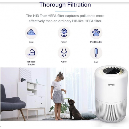 Druhou vrstvou je HEPA filter H13. To odlišuje Levoit od konkurencie, pretože filter HEPA H13 je oveľa kvalitnejší a spoľahlivejší ako bežne používané HEPA H11. Tu sa odfiltrujú jemné prachové častice, pleseň, baktérie, peľ, dymové častice, roztoče a srsť.