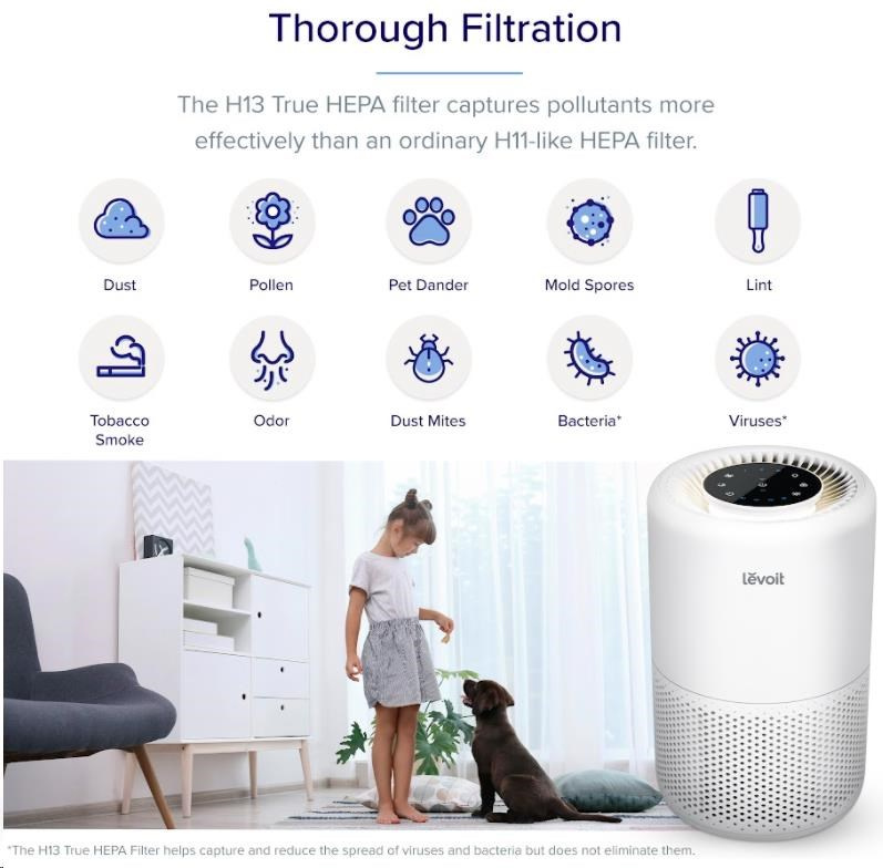 Druhou vrstvou je HEPA filter H13. To odlišuje Levoit od konkurencie, pretože filter HEPA H13 je oveľa kvalitnejší a spoľahlivejší ako bežne používané HEPA H11. Tu sa odfiltrujú jemné prachové častice, pleseň, baktérie, peľ, dymové častice, roztoče a srsť.