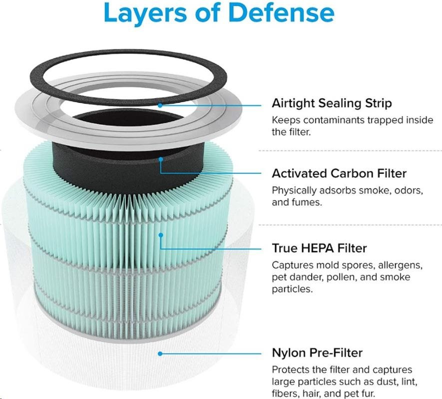 Druhou vrstvou je HEPA filter H13. To odlišuje Levoit od konkurencie, pretože filter HEPA H13 je oveľa kvalitnejší a spoľahlivejší ako bežne používané HEPA H11. Tu sa odfiltrujú jemné prachové častice, pleseň, baktérie, peľ, dymové častice, roztoče a srsť.