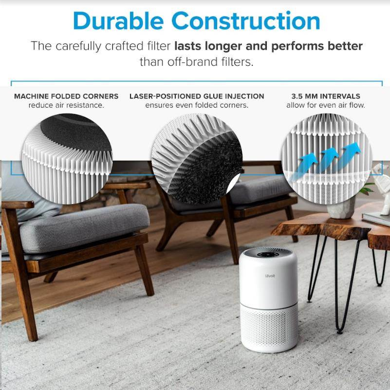 Druhou vrstvou je HEPA filter H13. To odlišuje Levoit od konkurencie, pretože filter HEPA H13 je oveľa kvalitnejší a spoľahlivejší ako bežne používané HEPA H11. Tu sa odfiltrujú jemné prachové častice, pleseň, baktérie, peľ, dymové častice, roztoče a srsť.