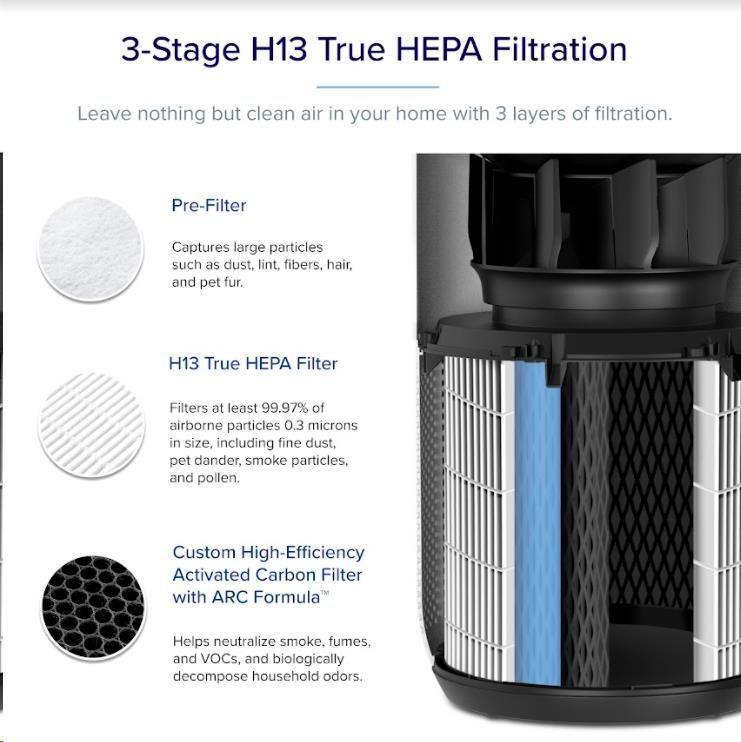 Druhou vrstvou je HEPA filter H13. To odlišuje Levoit od konkurencie, pretože filter HEPA H13 je oveľa kvalitnejší a spoľahlivejší ako bežne používané HEPA H11. Tu sa odfiltrujú jemné prachové častice, pleseň, baktérie, peľ, dymové častice, roztoče a srsť.