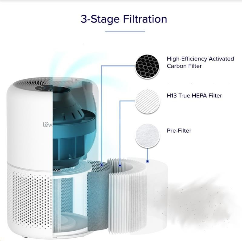 Druhou vrstvou je HEPA filter H13. To odlišuje Levoit od konkurencie, pretože filter HEPA H13 je oveľa kvalitnejší a spoľahlivejší ako bežne používané HEPA H11. Tu sa odfiltrujú jemné prachové častice, pleseň, baktérie, peľ, dymové častice, roztoče a srsť.