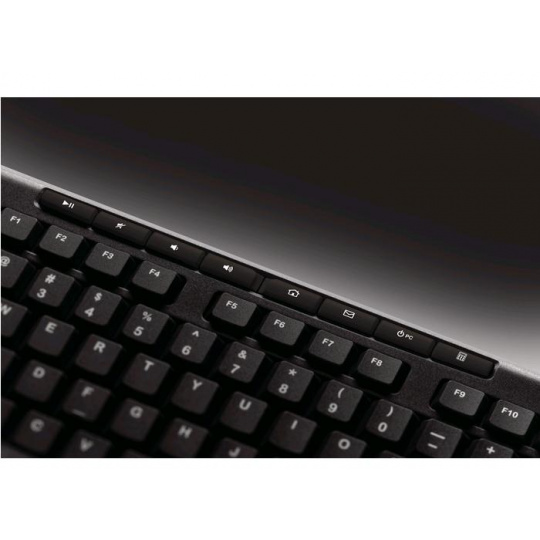 K jednoduchému používaniu prispieva osem prístupových tlačidiel a nastavenie plug-and-play, ktoré trvá len niekoľko sekúnd. Vďaka štandardnému rozloženiu klávesov v plnej veľkosti (vrátane numerickej klávesnice) nájdete všetky klávesy presne tam, kde ich očakávate. Klávesnica, ktorá vydrží - s vysokou kvalitou a spoľahlivosťou, ktorými je spoločnosť Logitech známa, v prevedení odolnom proti poliatiu a s klávesmi s UV potlačou pre dlhšiu životnosť.