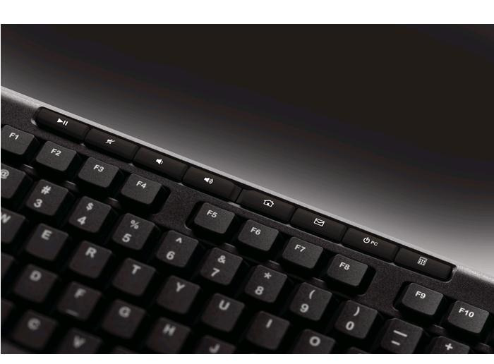 K jednoduchému používaniu prispieva osem prístupových tlačidiel a nastavenie plug-and-play, ktoré trvá len niekoľko sekúnd. Vďaka štandardnému rozloženiu klávesov v plnej veľkosti (vrátane numerickej klávesnice) nájdete všetky klávesy presne tam, kde ich očakávate. Klávesnica, ktorá vydrží - s vysokou kvalitou a spoľahlivosťou, ktorými je spoločnosť Logitech známa, v prevedení odolnom proti poliatiu a s klávesmi s UV potlačou pre dlhšiu životnosť.