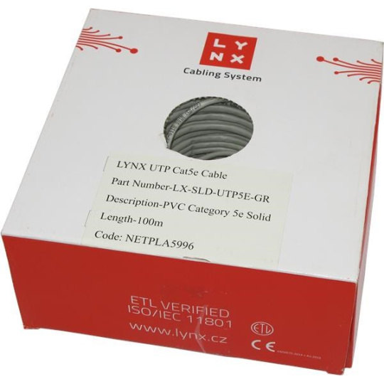 Inštalačný kábel LYNX Cat5E UTP je vhodný pre trvalé inštalácie vo vnútornom prostredí budov, stavieb a iných zariadení. Kábel je vhodný pre prenosové rýchlosti až 2,5 Gb/s. Kábel je vyrobený z medeného drôtu s priemerom 24AWG s PVC plášťom a triedou reakcie na oheň Dca.