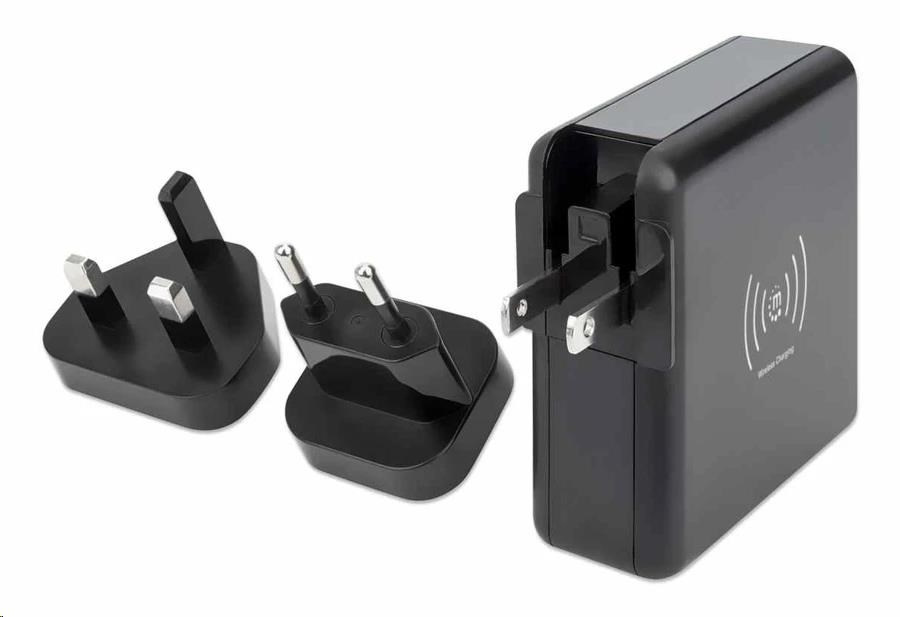 Cestovná sieťová nabíjačka a powerbanka Manhattan 4 v 1 s kapacitou 8 000 mAh vám poskytne neuveriteľne užitočné funkcie v jednom zariadení. Používajte ju ako nástennú nabíjačku USB na nabíjanie smartfónov, tabletov, elektronických čítačiek, slúchadiel a ďalších zariadení z dvoch portov USB-A a jedného portu USB-C s výkonom na port až 5 V/2.4 A. Môžete tiež úplne vynechať káble a nabíjať kompatibilné mobilné zariadenia na 5 W bezdrôtovej nabíjacej podložke. Pre ešte väčšie pohodlie vám tento univerzálny akumulátor umožňuje nabíjať na cestách bez pripojenia do zásuvky, pretože je to zároveň powerbanka s kapacitou 8 000 mAh. Praktický digitálny číselný displej vám umožní kedykoľvek skontrolovať zostávajúci stav batérie. Powerbanku môžete dobíjať priamo cez sieťovú zásuvku alebo cez port USB-C. Ak cestujete do zahraničia, určite sa vám bude páčiť skladacia zástrčka pre USA a vymeniteľné zástrčky pre Veľkú Britániu a EÚ, ktoré vám umožnia nabíjať zariadenia v mnohých regiónoch, ktoré ponúkajú tieto typy zásuviek.
