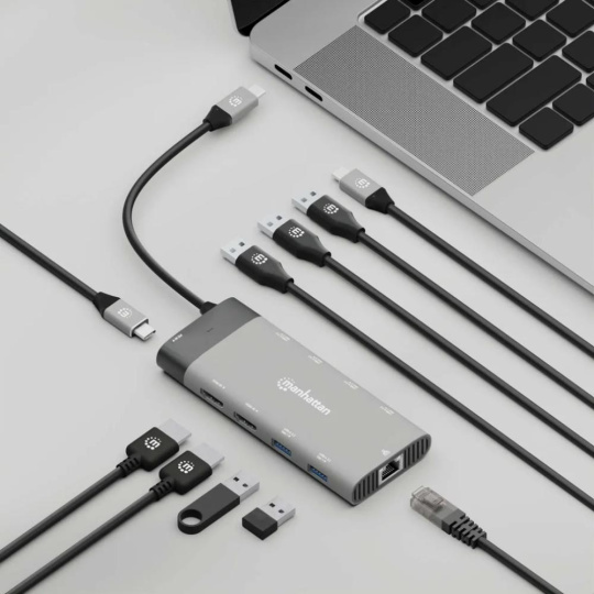 MANHATTAN Dokovací stanice USB-C 10v1, 2xHDMI, 2xUSB-C, 5xUSB, 1xRJ45, šedá