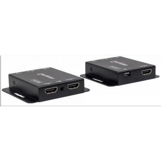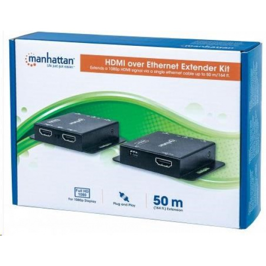 Súprava Manhattan 1080p HDMI over Ethernet Extender Kit je ideálnym riešením na pripojenie prakticky akéhokoľvek zdroja HDMI (PlayStation, Xbox, Blu-ray prehrávač, satelitný prijímač, digitálny rekordér atď.) k HD displeju alebo projektoru až do vzdialenosti 50 m (164 ft.) od zdroja prostredníctvom jedného ethernetového kábla Cat6. Tieto napájané extendery HDMI poskytujú spoľahlivý prenos videa s rozlíšením 1080p a viackanálového zvuku na väčšie vzdialenosti, ako je to možné len pomocou káblov HDMI. Modul vysielača má navyše ďalší výstupný port HDMI, ktorý umožňuje umiestnenie druhého monitora v riadiacej skrini alebo pripojenie druhého displeja. Na dodatočnú kontrolu kvality obsahuje súprava Manhattan 1080p HDMI over Ethernet Extender Kit prepínač EDID na minimalizáciu problémov so zobrazením, zabudovaný prepínač ekvalizéra na korekciu dlhodobého blikania obrazovky a širokopásmový IR blaster a prijímač na diaľkové ovládanie zdrojového zariadenia.