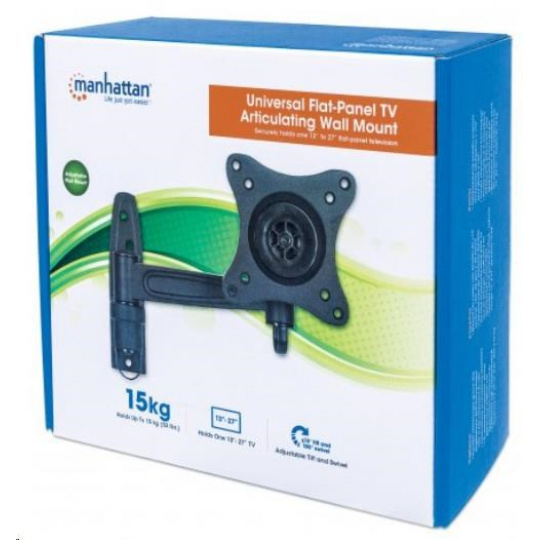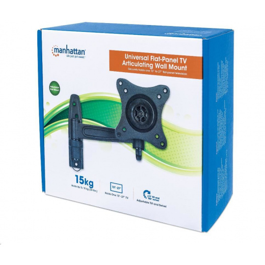 Prekonajte zvláštny pôdorys, nepríjemné oslnenie alebo nevhodné umiestnenie nábytku, ktoré môže obmedzovať pôžitok z vášho plochého televízora. Univerzálny kĺbový nástenný držiak na plochý televízor Manhattan sa zloží takmer naplocho k stene a bezpečne sa vysunie na silnom ramene, aby vám pomohol dosiahnuť najlepšie pozície na sledovanie takmer z ktoréhokoľvek miesta v miestnosti. Tento kĺbový nástenný držiak je kompatibilný so štandardom VESA a je vyrobený z kvalitných materiálov, takže sa hodí pre rôzne veľkosti displejov a umožňuje bezpečnú a istú inštaláciu televízora nad podlahou. Perfektne sa hodí na montáž televízora v obývacej izbe, spálni alebo pracovni, ako aj na komerčné použitie v hoteloch, učebniach, konferenčných miestnostiach, na digitálnu reklamu a podobne. Univerzálny nástenný držiak na plochý televízor Manhattan, nech ho nainštalujete kamkoľvek, vám poskytne najlepší zážitok zo sledovania televízora.