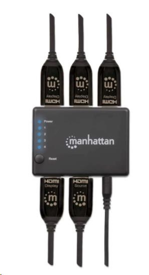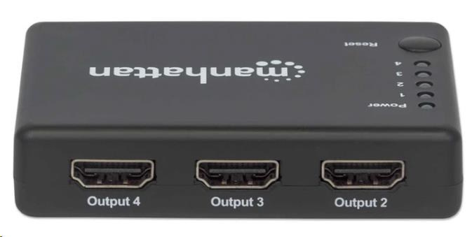 Manhattan 4K 4-portový rozdeľovač HDMI so zabudovaným zosilňovačom prenáša signál 4K HDMI z jedného zdroja UHD až na štyri displeje UHD.