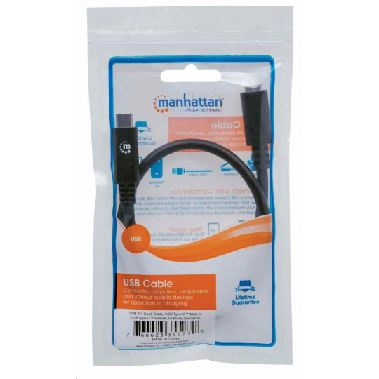 Predlžovací kábel Manhattan SuperSpeed+ USB-C umožňuje lepší prístup k portu alebo pripojeniu typu C. Tento predlžovací kábel môžete použiť na predĺženie vzdialenosti kábla typu C, na uľahčenie prístupu k portu typu C alebo na zabránenie opotrebovaniu portu. Predlžovací kábel Manhattan SuperSpeed+ USB-C je ideálny na použitie s akýmkoľvek zariadením USB Type-C typu plug-and-play a podporuje rýchly a spoľahlivý prenos dát rýchlosťou až 10 Gb/s v systémoch Windows a Mac a prúd až do 5 A (100 W). Poniklované kontakty, tienenie a plne tvarované pätky s odľahčením ťahu zabezpečujú spoľahlivé pripojenie, maximálnu vodivosť a minimálnu stratu dát pri zníženom rušení EMI.