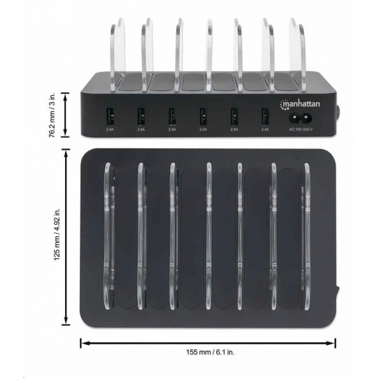 Prenosná elektronika s rozhraním USB kladie vysoké nároky na napájanie batérií a 6portová nabíjacia stanica Manhattan USB pomáha udržiavať vaše tablety, mobilné telefóny, digitálne fotoaparáty a ďalšie zariadenia nabité a pripravené na použitie. Táto nabíjacia stanica sa pripája do akejkoľvek štandardnej zásuvky a ponúka rýchle nabíjanie. Stanica s celkovým výkonom 50 W ponúka technológiu Smart IC na optimalizáciu nabíjania zariadení. Každý port podporuje až 5 V/2.4 A na rýchle nabíjanie smartfónov a iných prenosných zariadení. Okrem toho inteligentne chráni seba a vaše zariadenia pred skratom, prepätím, nadprúdom a prehriatím.