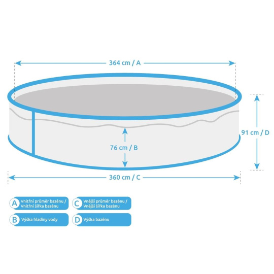 Uvedené rozmery bazéna sú iba orientačné a môžu ich ovplyvniť rovnosť podkladu alebo objem napustenej vody. Povolená výrobcná odchýlka je 5 %.