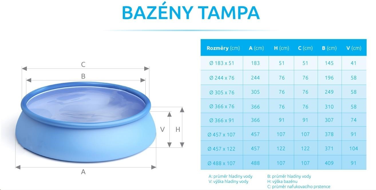 Bazén Tampa patrí medzi najpredávanejšie a najobľúbenejšie bazény v Českej republike. Kúpanie vo vlastnom bazéne si môže dopriať naozaj každý. Prednosťou bazéna Tampa je nízka cena, jednoduchá údržba a rýchle spustenie do prevádzky. Stačí len pripraviť miesto na bazén, rozvinúť bazénovú podložku, rozbaliť bazén, nafúknuť horný límec a začať plniť vodou. Stúpajúca voda sama bazén postaví. Od rozbalenia bazéna môžete do 10 minút plniť vodou. Bazén je potrebné po skončení sezóny vyčistiť, vypustiť a uložiť na suché, nemrznúce miesto. Správnou údržbou predĺžite životnosť bazéna. Odporúčame po kúpaní bazén prikryť krycou plachtou. Pre jednoduché nafúknutie odporúčame zakúpiť ručnú alebo elektrickú pumpu. Bazénová fólia: Steny a dno sú vyrobené z pružného a pevného 3vrstvového POLYSTRENGHT PVC materiálu. Farba imituje vzhľad ratanu. Pripojenie filtrácie: K bazénu môžete pripojiť ľubovoľnú kartušovú alebo pieskovú filtráciu z našej ponuky. Pre napojenie filtrácie sú pripravené prechody stenou bazéna s priemerom 32 mm (5/4"). Pre pripojenie pieskovej alebo kartušovej filtrácie je potrebné dokúpiť: 6 ks bazénových hadíc 2 ks prechodov stenou bazéna 1 ks inštalačnej sady Súčasťou balenia bazéna Tampa: bazén Tampa návod záslepky prechodov stenou bazéna Tolerance rozmerov bazéna: Uvedené rozmery bazéna sú iba orientačné a môžu ich ovplyvniť rovnosť podkladu, objem napustenej vody alebo nafúknutie límca. Povolená výrobková odchýlka je 5 %. Upozornenie: Fotografie produktu sú ilustračné. Zapustenie bazéna Tampa: Bazén Tampa nie je určený na úplné ani čiastočné zapustenie do zeme. Ide o nadzemný bazén. Uskladnenie bazéna Tampa: Bazén Tampa nie je určený na celoročný prevádzku, a preto by mal byť na konci kúpacej sezóny zazimovaný. Bazén je potrebné vypustiť, umyť od nečistôt, vysušiť a uložiť na suché miesto, kde nemrzne. Odporúča sa ho počas zimy občas preskladať, aby vo fólii nevznikali záhyby. Tým si predĺžite jeho životnosť. Rozmery a typ bazéna Farba: vzhľad Ratan Priemer bazéna: 3,66 m Priemer hladiny vody: 307 cm Výška bazéna: 0,91 m Celkový objem vody v bazéne: 6,6 m3 Modelová rada: Bazény Tampa Konstrukcia: Samonosný bazén Bazén: Bez filtračného systému Tvar bazéna: Kruhový Vybavenie bazéna Krycia plachta súčasťou balenia: Nie Podložka súčasťou balenia: Nie Schodíky súčasťou balenia: Nie Skimmer súčasťou balenia: Nie Rozmery a hmotnosť balenia 1. balík: 50 x 37 x 26 cm, 14,3 kg Hmotnosť: 14,29 kg