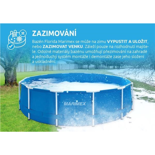 Bazén Florida Marimex môžete zazimovať a nechať vonku, alebo ho vypustiť a složiť. Ak sa rozhodnete ho uložiť, bazén je potrebné vypustiť, umyť od nečistôt, osušiť a uložiť na suché miesto, kde nemrzne. Je vhodné ho počas zimy občas preložiť, aby v fólii nevznikali záhyby. Ak sa bazén rozhodnete nechať na záhrade, je potrebné vypustiť vodu, odpojiť filtráciu a ďalšie príslušenstvo a do bazéna aplikovať chemické prípravky na zazimovanie bazéna.
