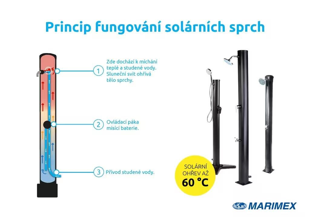 Zabezpečí ohrev vody dodávanej zo záhradnej hadice a tým dokonalý pocit pohodlia pri sprchovaní teplou alebo vlažnou vodou. Ohrev vody zabezpečuje slnečné žiarenie a telo sprchy, ktoré funguje ako solárny kolektor.