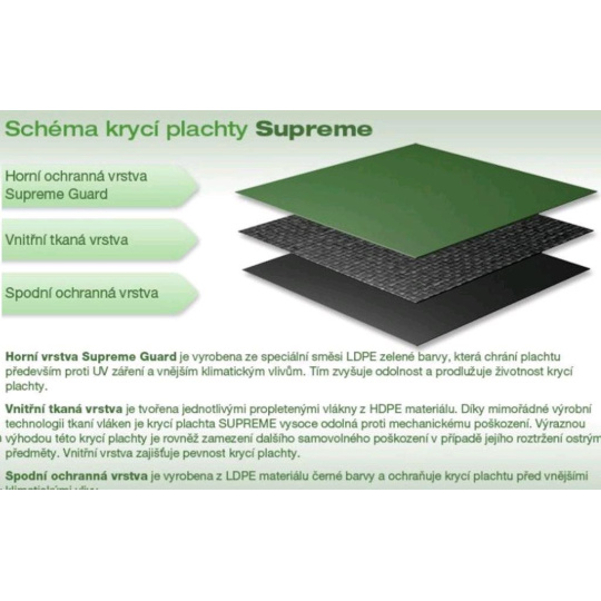 Vďaka použitiu ochranného vrstvy Supreme Guard je krycia plachta Supreme pevnejšia a lepšie odoláva poveternostným vplyvom – nejedná sa ale o zimnú plachtu a používanie pri teplotách pod bodom mrazu znižuje životnosť krycej plachty.