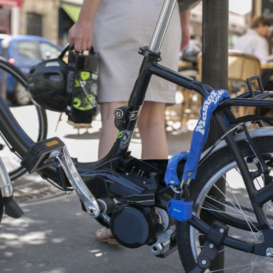 Pevný oceľový reťaz s oceľovým visacím zámkom je 90 cm dlhý a obsahuje oceľové spojky s priemerom 6 mm, ktoré odolávajú rezaniu. Nylónový kryt reťaza zabraňuje poškrabaniu. Visací oceľový zámok s priemerom 40 mm je odolný voči poveternostným vplyvom. Plastový kryt na visacom zámku zabraňuje poškrabaniu. Tŕň s priemerom 9 mm je vyrobený z ocele pre odolnosť voči rezaniu. Obsahuje 4-četný valček, ktorý zabraňuje rozrušeniu, a dvojitú západku odolnú voči vypáčeniu.
