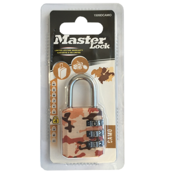 Visací kombinačný zámok 1509EURDCAMO pre všeobecnú ochranu. Zinkové telo zámku má šírku 30mm. Oceľový trmen s priemerom 5mm je dlhý 22mm a je vyrobený z chromovanej ocele a ponúka odolnosť proti rezaniu a preťahovaniu. Vlastné nastavenie 3-miestneho kombinácie zámku ponúka pohodlie bez kľúča.