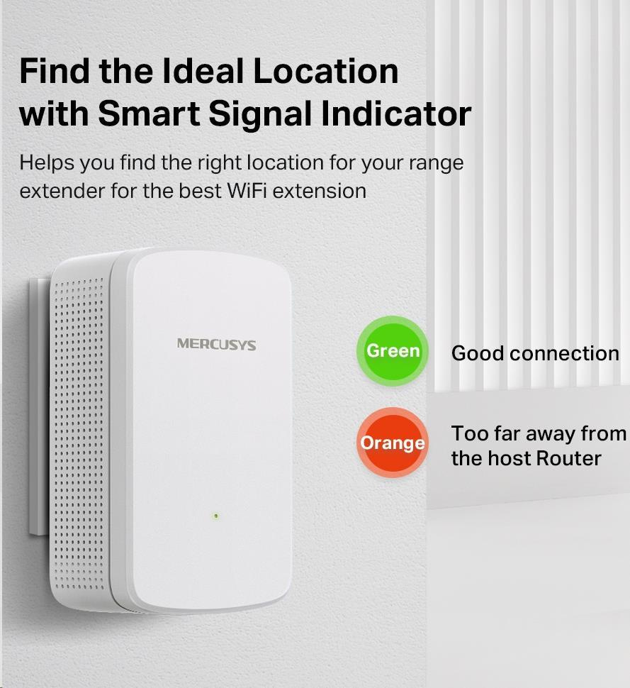 - Ukazovateľ signálu – farebný LED indikátor vám pomôže nájsť správne umiestnenie extenderu signálu, aby bolo Wi-Fi pokrytie čo najlepšie