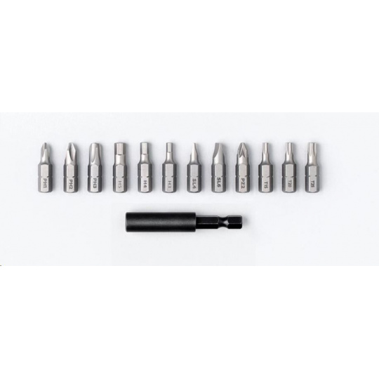 12 vysoko kvalitných bitov z legovanej ocele S2 s dvojitou antikoróznou vrstvou, s tvrdosťou až 60 HRC, zaisťujúce dlhodobé používanie. Predlžovacia tyč je ideálna na používanie v tesných alebo ťažko dostupných miestach.