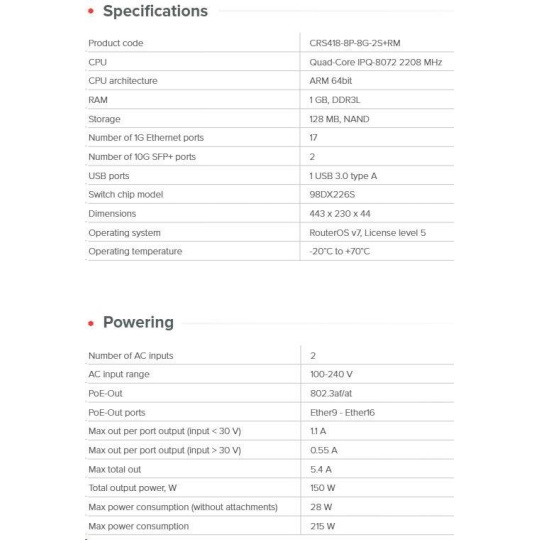 PoE CRS switch s 16x Gbps LAN (8 z nich s POE-out) , 2x 10Gbps SFP+, 1x USB 3.0 a dvěma RJ45 porty (management a konzole) v rack provedení. CRS418-8P-8G-2S+RM je dostatečně výkonný na to, aby nahradil většinu routerů pro malé a střední kanceláře. Vhodný především pro hybridní sítě na 2/3 vrstvě - ať už segmentujete síť pomocí VLAN, nebo mezi nimi routujete. Díky čtyřjádrovému procesoru ARM s frekvencí 2,2 GHz, HW offloading L3 a systému RouterOS v7 jej můžete používat jako internetovou bránu, firewall, a dokonce i jako řadič CAPsMAN. Využít můžete 8 PoE-out portů (802.3af/at a 24V pasivní PoE-out) pro napájení zařízení přímo ze switche s až 150 W celkového výkonu, inteligentním řízením PoE a omezením proudu na port. Praktické řešení pro instalace vyžadující nepřetržitý provoz s enormními objemy dat Technické specifikace: Product code: CRS418-8P-8G-2S+RM CPU: Quad-Core IPQ-8072 2208 MHz Size of RAM: 1 GB, DDR3L Storage: 128 MB, NAND Number of 1 GbE Ethernet ports: 17 10G SFP+ ports: 2 USB ports: 1 USB 3.0 type A Operating system: RouterOS v7 (License level 5) Supported input voltage: 2x AC power supply 100 - 240 V Dimensions: 443 x 230 x 44 mm Operating temperature: -20°C to +70°C Napájecí specifikace: PoE-out: 802.3af/at PoE-out ports: Ether9 - Ether16 Max out per port output (input < 30 V) : 1.1 A Max out per port output (input > 30 V): 0.55 A Max total out : 5.4 A Total output power, W: 150 W Max power consumption: 215 W Max power consumption without attachments: 28 W Upozornění: Výrobce MIKROTIK nevztahuje záruku na zařízení poškozená přepětím. Zařízení je třeba na vstupech adekvátně chránit proti indukovanému elektrostatickému přepětí či přepěťovým špičkám na silovém vedení. Při venkovních instalacích je třeba používat stíněnou kabeláž (FTP/SFTP), příslušné přepěťové ochrany (pokud nejsou integrovány) a provést korektní a efektivní uzemnění. Zařízení vždy provozujte s poslední výrobcem publikovanou verzí (výrobcem označenou "Stable") operačního systému RouterOS. Taková verze garantuje nejoptimálnější funčknost, obsahuje opravené chyby z verzí předchozích a výkonová vylepšení..