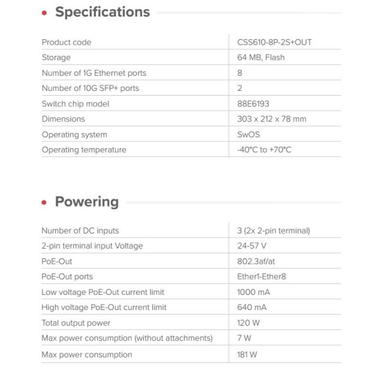 Kompaktní PoE switch s integrovanou UPS a inteligentní nabíječkou baterií – garance bezvýpadkového provozu CCTV kamer a přístupových bodů při výpadích napájení. Výpadky proudu by neměly znamenat prostoje. NetPower Lite 8P poskytuje spolehlivé napájení přes Ethernet i v případě výpadku elektrické sítě. Integrovaná UPS a inteligentní nabíječka spolupracují s vaší externí 24V baterií a mohou poskytovat vysokonapěťový výstup PoE i z nízkonapěťových zdrojů stejnosměrného proudu. netPower je tak ideální volbou pro CCTV, kanceláře, bytové domy a instalace v rámci inteligentních měst. NetPower Lite 8P je vybaven osmi gigabitovými ethernetovými porty s výstupem PoE 802.3af/at a dvěma 10G SFP+ uplinky pro vysokorychlostní backhaul. Používá systém SwOS Lite – rychlý, efektivní a příjemně jednoduchý na správu. SwOS je konfiguratelné z webového prohlížeče, vedle bežných funkcí řiditelných switchů umožňuje například • port-to-port forwarding management • apply MAC filter • configure VLANs • mirror traffic • apply bandwidth limitation • adjust some MAC and IP header fields Napájení je flexibilní, stačí připojit 24–57 V DC do 2-pinového terminálu. Stejně jako naše ostatní zařízení vhodná pro venkovní použití je i tento přepínač konstruován tak, aby vydržel. S provozním rozsahem od –40 °C do +70 °C funguje netPower Lite 8P i tam, kde by mnoho jiných zařízení již selhalo. Přepínač může odebírat až 181 W celkem, s rozpočtem 120 W PoE-Out. Pokud je příchozí výkon omezen, PoE je automaticky upřednostněno – nejprve se zpomalí nabíjení, aby vaše základní zařízení zůstala online. Integrovaná podpora UPS je efektivní, spolehlivá, nabízí různé možnosti : Připojte baterii s nominálním napětím 24 V – obvykle dvě 12V jednotky zapojené do série – a přepínač se okamžitě stane malým, efektivním UPS. Během výpadku napájení zůstávají zařízení PoE online bez jakýchkoli přerušení. Nabíječka podporuje zaplavené, AGM a gelové olověné baterie, stejně jako LiFePO4 (lithium-železo-fosfátové baterie) s příslušným BMS. Subsystém nabíječky je navržen pro nabíjení baterií přes 2pinový konektor v proudovém rozsahu 0,2–1,6 A a napěťovém rozsahu 20–31,7 V. Součástí je teplotní senzor, který jemně ladí napětí pro olověné baterie a blokuje nabíjení, když teploty překročí bezpečný rozsah. To pomáhá prodloužit životnost baterie. Podrobné technické specifikace: Product code: CSS610-8P-2S+OUT Storage: 64 MB, Flash Number of 1G Ethernet ports: 8 Number of 10G SFP+ ports: 2 Switch chip model: 88E6193 Dimensions: 303 x 212 x 78 mm Operating system: SwOS Operating temperature: -40°C to +70°C Napájení: Number of DC inputs: 3 (2x 2-pin terminal) 2-pin terminal input Voltage: 24-57 V PoE-Out: 802.3af/at PoE-Out ports: Ether1-Ether8 Low voltage PoE-Out current limit: 1000 mA High voltage PoE-Out current limit: 640 mA Total output power: 120 W Max power consumption (without attachments): 7 W Max power consumption: 181 W Upozornění: Výrobce MIKROTIK nevztahuje záruku na zařízení poškozená přepětím. Zařízení je třeba na vstupech adekvátně chránit proti indukovanému elektrostatickému přepětí či přepěťovým špičkám na silovém vedení. Při venkovních instalacích je třeba používat stíněnou kabeláž (FTP/SFTP), příslušné přepěťové ochrany (pokud nejsou integrovány) a provést korektní a efektivní uzemnění. Zařízení vždy provozujte s poslední výrobcem publikovanou verzí (výrobcem označenou "Stable") operačního systému RouterOS/SwOS. Taková verze garantuje nejoptimálnější funčknost, obsahuje opravené chyby z verzí předchozích a výkonová vylepšení. .