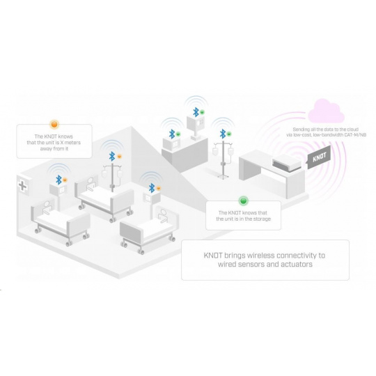 KNOT dokáže monitorovať integrované GPIO, konvertovať protokol RS485/Modbus na TCP/IP a tiež pakety Bluetooth na TCP/IP pomocou HTTPS alebo MQTT. KNOT možno použiť ako prevodník zo snímačov s káblom RS485/Modbus na odosielanie údajov na server Modbus. Áno, KNOT prináša bezdrôtové pripojenie ku káblovým snímačom a akčným členom, ako sú merače a relé. Napríklad predajný automat so snímačmi teploty a vlhkosti pripojený k systému KNOT môžete spravovať len s niekoľkými megabajtmi denne!
