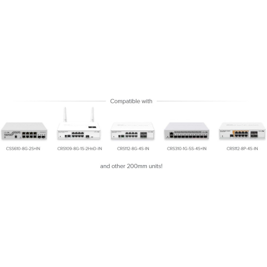 Popis produktu Rackmount kit RMK-2/10 umožňuje instalaci dvou menších zařízení MikroTik s šířkou 200mm do tradičních 19 palcových datových rozvaděčů. Případně můžete natrvalo odstranit delší část z obou držáku a nainstalovat pouze jedno MikroTik zařízení s šířkou 200mm do klasického 10 palcového racku. Seznam kompatibilních zařízení CSS610-8G-2S+IN CRS109-8G-1S-2HnD-IN CRS112-8G-4S-IN CRS310-1G-5S-4S+IN CRS112-8P-4S-IN Obsah balení (2) Držák Šroubky Technické parametry Fyzické charakteristiky Velikost:10", 19" Provedení:Rackmount Materiál:Hliník.