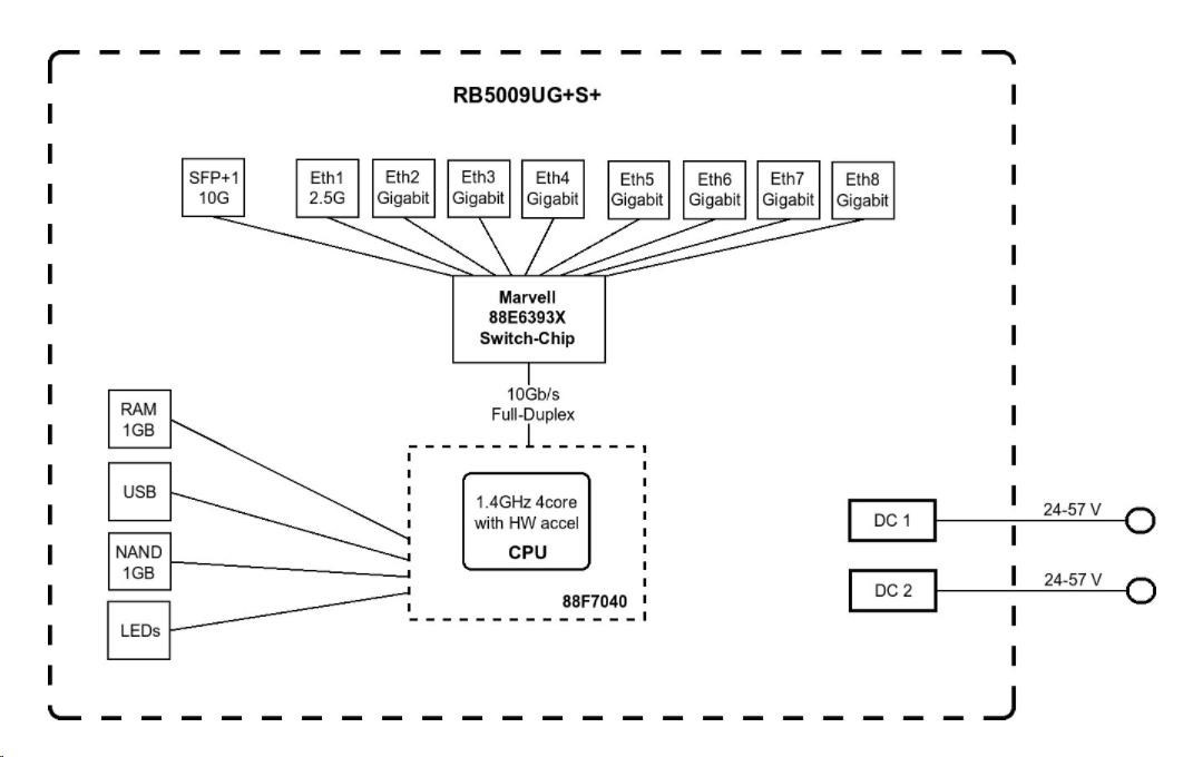 RB5009 je úplne nový rad RouterBOARD, ktorý je vybavený pasívnym chladením, inovatívnym až futuristickým dizajnom a vysokým výkonom (o 60-90 % vyšším ako RB4011) vďaka 64-bitovej architektúre procesora ARM s taktom 1400 MHz, 1 GB DDR4 RAM a 1 GB úložiska NAND. Smerovač má 7x gigabitovú sieť LAN, 1x 2.5Gbit LAN s PoE (24-57 VDC, 802.3af/at), ale aj prostredníctvom DC konektora alebo svorkovnice na ľavej strane, 1x SFP+ slot a 1x USB 3.0. Vďaka konštrukcii kovového šasi možno smerovač namontovať do 19" stojana s voliteľným príslušenstvom. Vďaka priestorovo úsporným rozmerom sa do výšky 1U zmestia až 4 routre naraz!