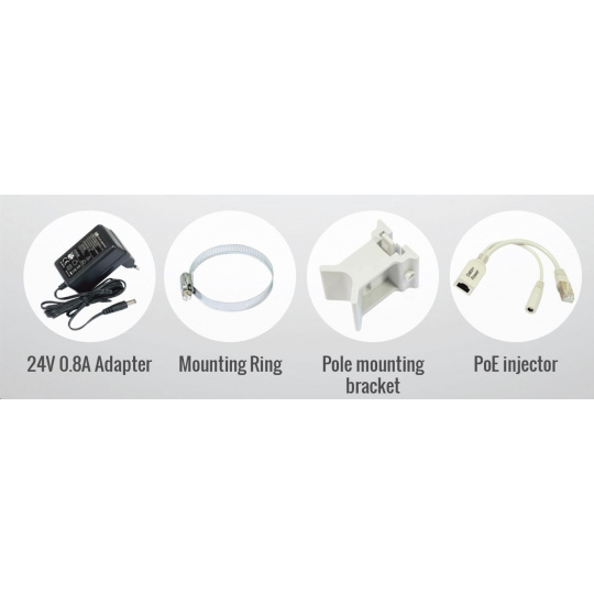 Balenie obsahuje SXT SA ac, injektor PoE, napájací zdroj, montážnu sadu na stožiar