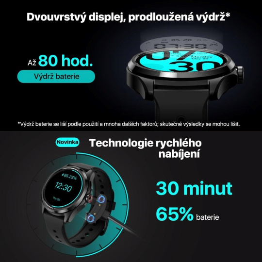 Technológia Dual Display od spoločnosti Mobvoi používa dva displeje. Základom je skvelý AMOLED displej, nad ním je druhý úsporný displej. To umožňuje plynulé prepínanie medzi základným a inteligentným režimom a vďaka tomu hodinky poskytujú výrazne dlhšiu výdrž na batériu.
