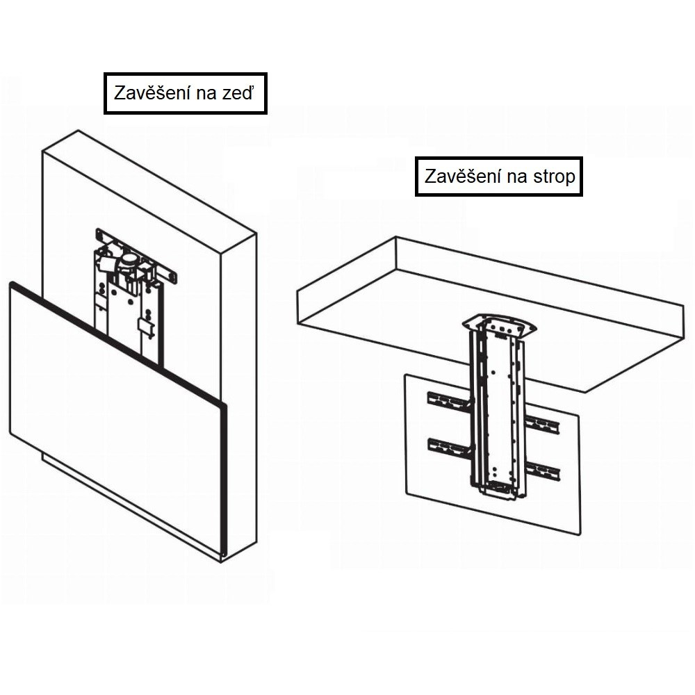 Motorizovaný stropný držiak TV Fiber Mounts FM-KD2 Motorizovaný stropný držiak na TV 42-65", sťahovanie TV max. 80cm, nosnosť 80kg, diaľkové ovládanie Diaľkovo ovládaný profesionálny stropný držiak na televízie s uhlopriečkou 42-65". Spoľahlivý a tichý pohon zabezpečí zníženie televízie až o 80cm. Rýchlosť zníženia a vystúpenia TV 2cm / s, napájanie 230V. Systém pre zakrytie káblov. Vyššia nosnosť a spoľahlivosť, záruka 5 rokov. Motorizovaný elektrický držiak na TV pre inštaláciu na strop alebo na stenu - Fiber Mounts FM-KD2 Motorizovaný držiak TV FM-KD2 je možné inštalovať aj na stenu. V takom prípade je možné, aby televízia vyťahovala napr. z priečinka alebo je možné aj použitie na interaktívnu TV alebo tabuľu. Elektrický motorizovaný držiak na televíziu pre inštaláciu TV na strop alebo na stenu - Fiber Mounts FM-KD2 Technické údaje: nosnosť 80kg podpora VESA štandardu 200x200 až 800x400 vhodný na zavesenie televízorov a monitorov s uhlopriečkou 42" až 65" výškovo nastaviteľný 800mm rýchlosť pohybu 20mm / 1s diaľkové ovládanie veľmi jednoduchá inštalácia veľmi pekný dizajn spoľahlivosť a bezpečnosť napájanie 220-230V spotreba energie pri chode len 80W záruka 5 rokov Stropný / nástenný držiak na televízie, motorizovaný, na DO, zdvih 80cm, nosnosť 80kg, VESA 200x200 až 800x400 Fiber Mounts FM-KD2 Motorizovaný stropný držiak TV Fiber Mounts FM-KD2 podporuje VESA štandardy: VESA 200x200 VESA 300x200 a 200x300 VESA 300x300 VESA 400x200 a 200x400 VESA 400x300 a 300x400 VESA 400x400 VESA 600x400 VESA 800x400 Motorizovaný elektrický stropný držiak TV FM-KD2 je vhodný pre televízie aj monitory s maximálnou uhlopriečkou 65" (165cm), na väčšie obrazovky je vhodný iba v prípade inštalácie na stenu.