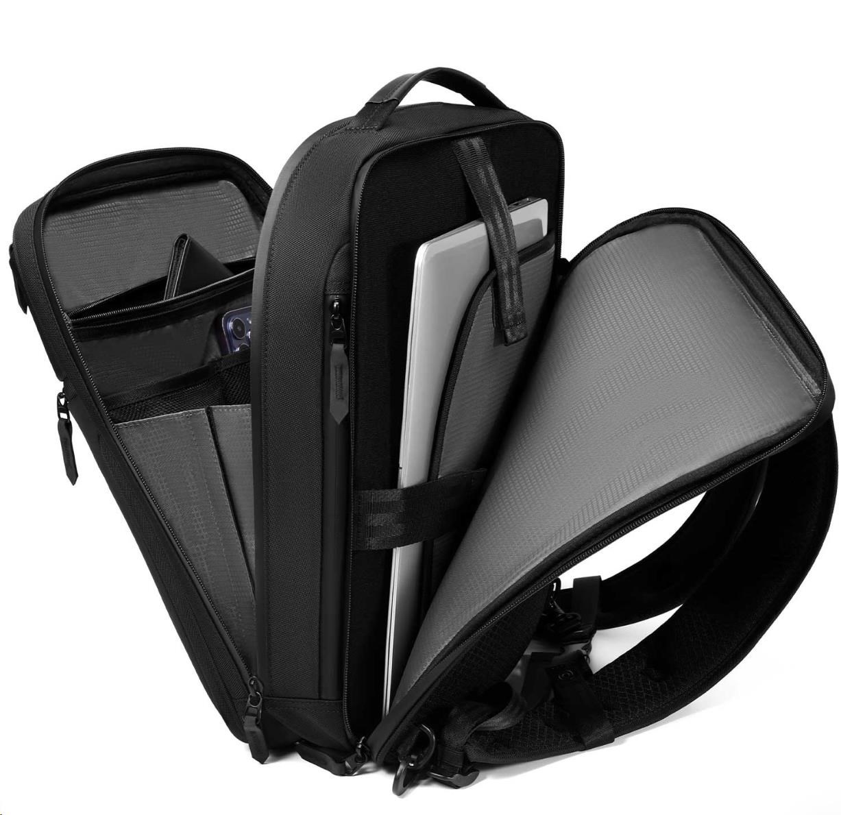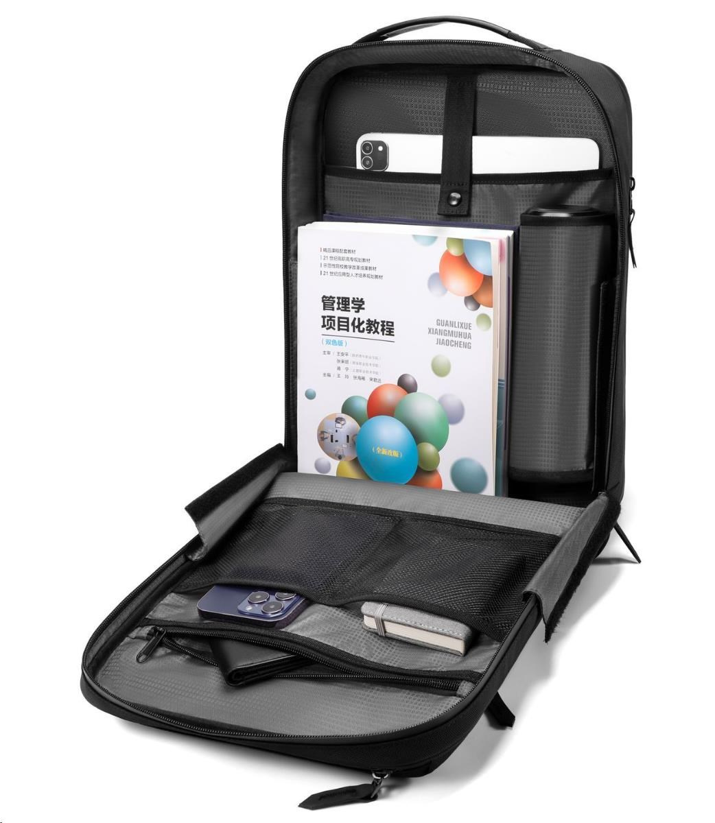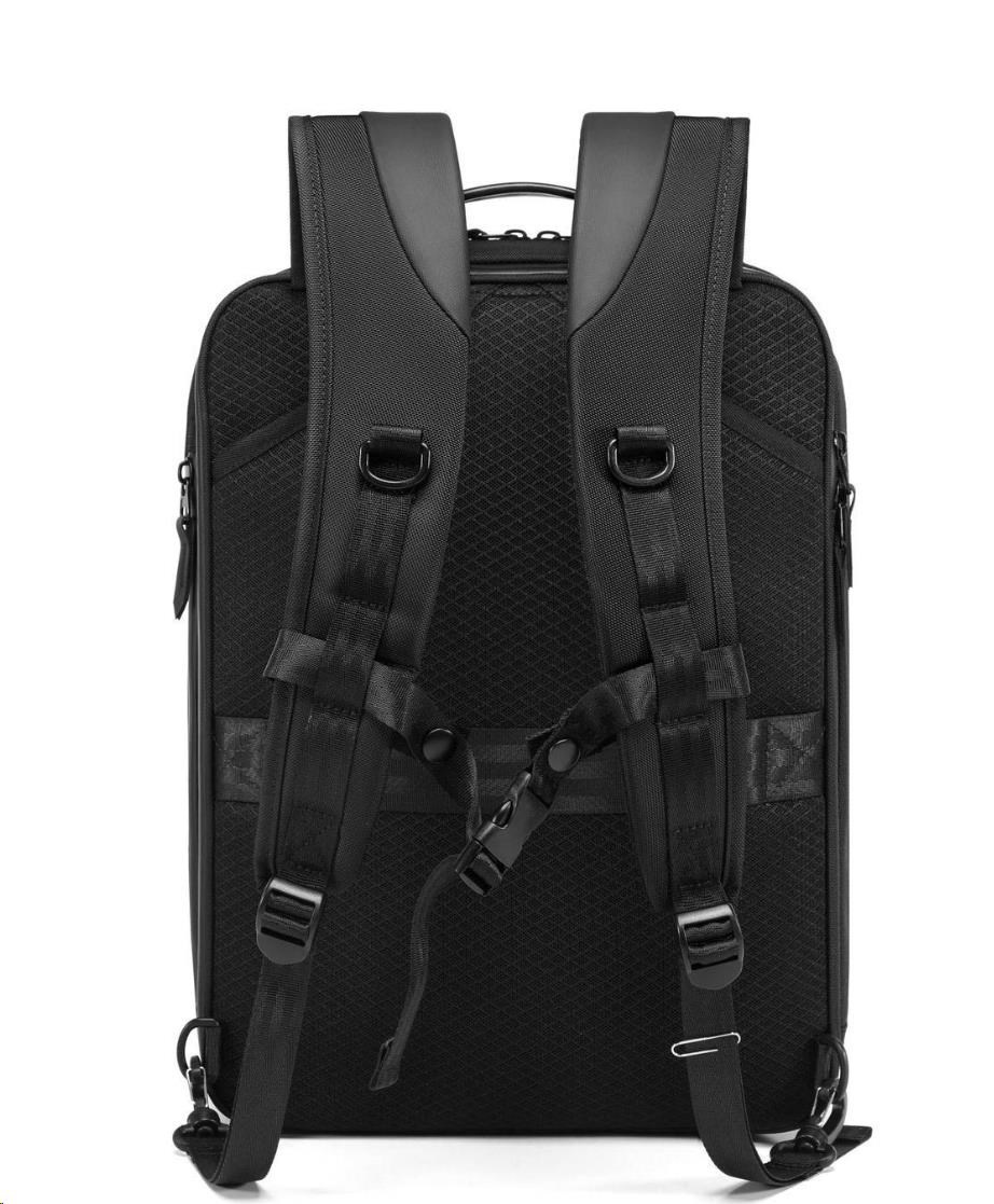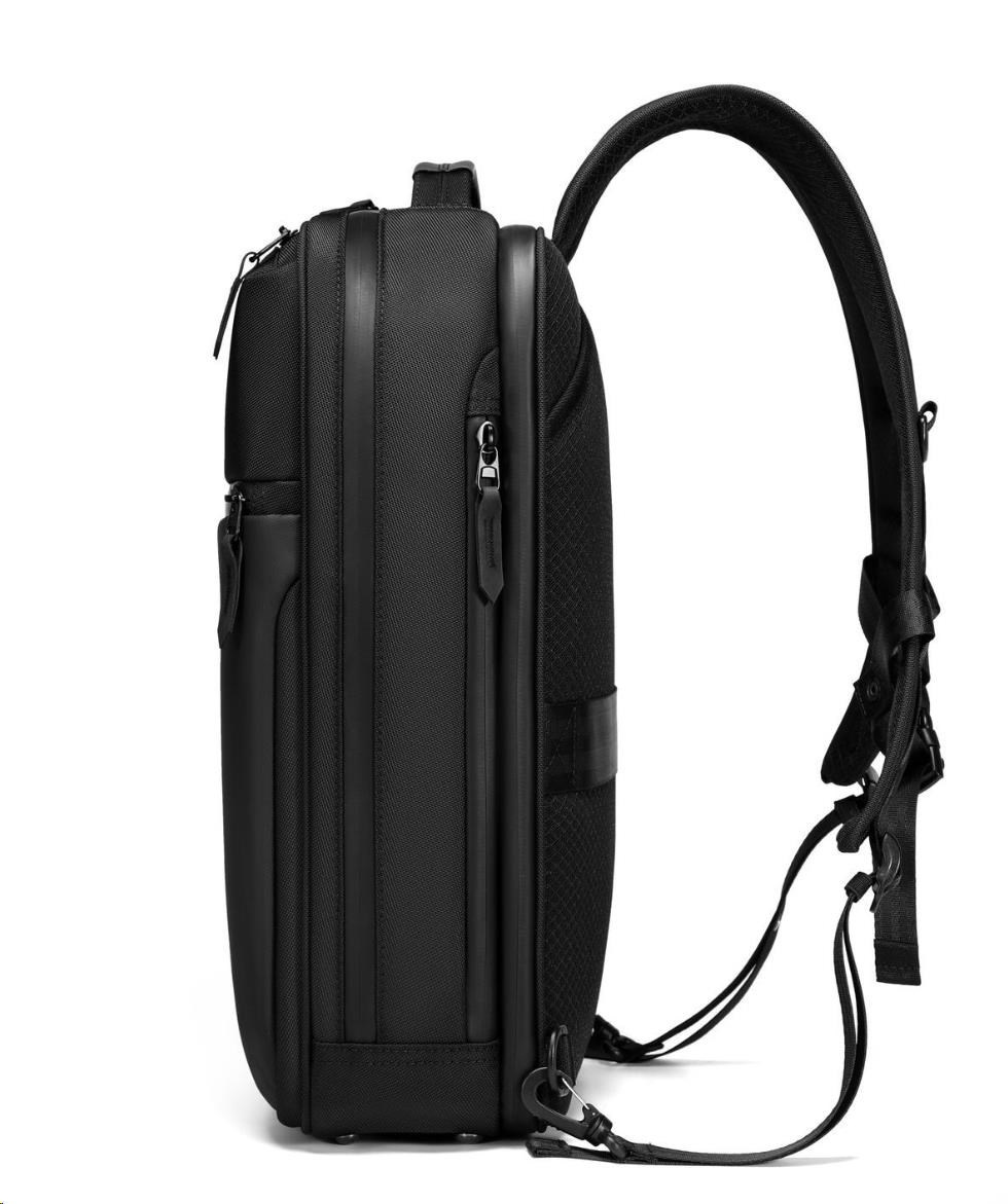 MYBALO ASTON Perfektní volba pro minimalisty s dobrým vkusem  6 ikon: - Nejtenčí batoh - Elegantní - Kapsa na notebook do 15,6" - Kapsa na tablet do 9" - Otevírání o 180 stupňů - USB a USB-C port - Drží tvar - Voděodolný - Skryté kapsy  Elegantní a minimalistický Jedná se o velmi elegantní a minimalistický batoh. S tímto parťákem neuděláte chybu při běžném nošení do města, ani na důležité schůzce.  Tenký batoh MYBALO Aston je batoh s vůbec nejmenší hloubkou z naší nabídky. Díky tomu působí elegantně a minimalisticky, ale i přesto se do něj vejdou všechny vaše nezbytnosti.  Kvalitní voděodolný materiál, dlouhá životnost Kvalitní umělá kůže zajišťuje trvanlivost a odolnost batohu proti vodě a opotřebení. MYBALO Aston tak bude vaším společníkem opravdu dlouho.  Drží tvar Batoh si zachovává svůj tvar také v případě, že jej budete mít úplně prázdný.  Vestavěný USB a USB-C port Nabíjejte svá elektronická zařízení kdekoli a kdykoli díky vestavěnému USB a USB-C portu.  Popruh k uchycení na kufr Cestujte pohodlně. Kdykoli chcete mít volná záda, jednoduše připevněte batoh na rukojeť svého kufru.  Pohodlné polstrování Užijte si komfortní nošení díky kvalitnímu a prodyšnému polstrování ramenních popruhů a zádové části.  Další praktické kapsy Zorganizujte si pohodlně a snadno své věci díky množství vychytaných kapes.  Skryté kapsy V zádové části a na ramenním popruhu najdete skryté kapsy pro bezpečné uložení cenností.  Vnitřní kapsy Vnitřní kapsy slouží pro snadnou organizaci všech vašich věcí.  Přední kapsa Přední kapsa je určena pro věci, které chcete mít rychle a snadno po ruce.  Parametry: - Rozměry: 46 x 30 x 9 cm - Objem: 11 l - Hmotnost: 1,19 kg - Kapsa na notebook: Ano (do vel. 15,6") - Kapsa na tablet: Ano (do vel. 9") - USB port: Ano - Voděodolnost: Ano - Hlavní materiál: Ekokůže + Polyester - Podšívka: Polyester - Barva: Černá