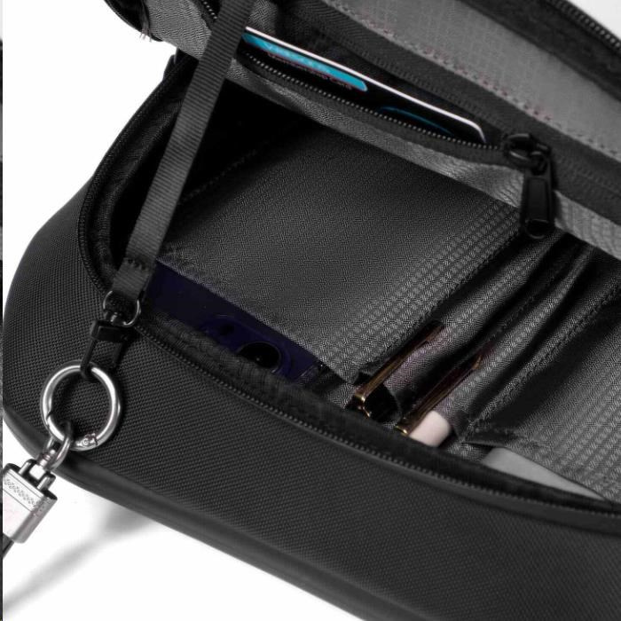 úložný priestor tašky je rozdelený do dvoch hlavných priečinkov, niekoľkých vnútorných priečinkov a skrytej kapsy. Všetko je možné prehľadne uložiť a vyhnúť sa hľadaniu a prehrabávaniu.