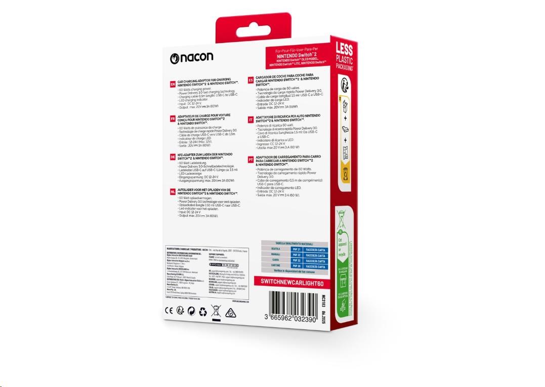 S týmto nabíjacím adaptérom od spoločnosti Nacon môžete pri cestovaní autom ľahko nabiť nielen novú hernú konzolu Nintendo Switch 2, ale aj konzolu Nintendo Switch, Switch Lite alebo Switch – OLED Model. Adaptér jednoducho zapojíte do zásuvky zapaľovača v automobile a s pomocou USB-C kábla o dĺžke 1,5 metra ho následne prepojíte s konzolou, pričom o aktuálnom stave jej nabíjania vás bude informovať príslušný LED indikátor. A pretože adaptér ponúka nabíjací výkon až 60 wattov a podporuje technológiu rýchleho nabíjania Power Delivery 3.0, bude vaša konzola znova plne nabitá skôr, než sa nazdáte.