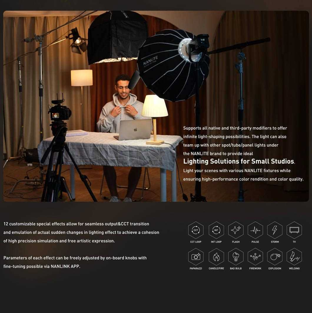 Vďaka predprogramovaným prispôsobiteľným špeciálnym efektom sa so svetlom FS-60B ľahko simulujú špecifické a kreatívne scénáre osvetlenia. Svetlo imituje 12 rôznych svetelných efektov vrátane CCT loop, INT loop, blesku, pulzov, búrky, televízie, paparazzi, sviečok/ohní, vadných žiaroviek, ohňostrojov, výbuchu a zábleskov pri zváraní.