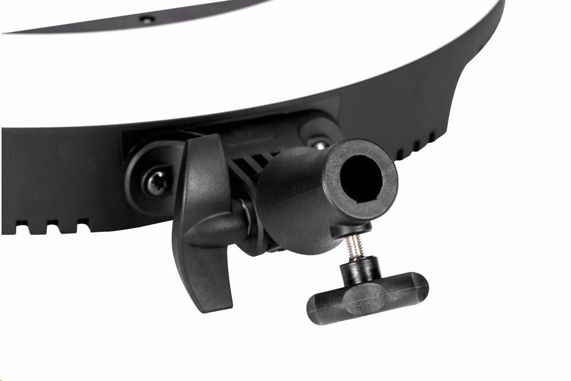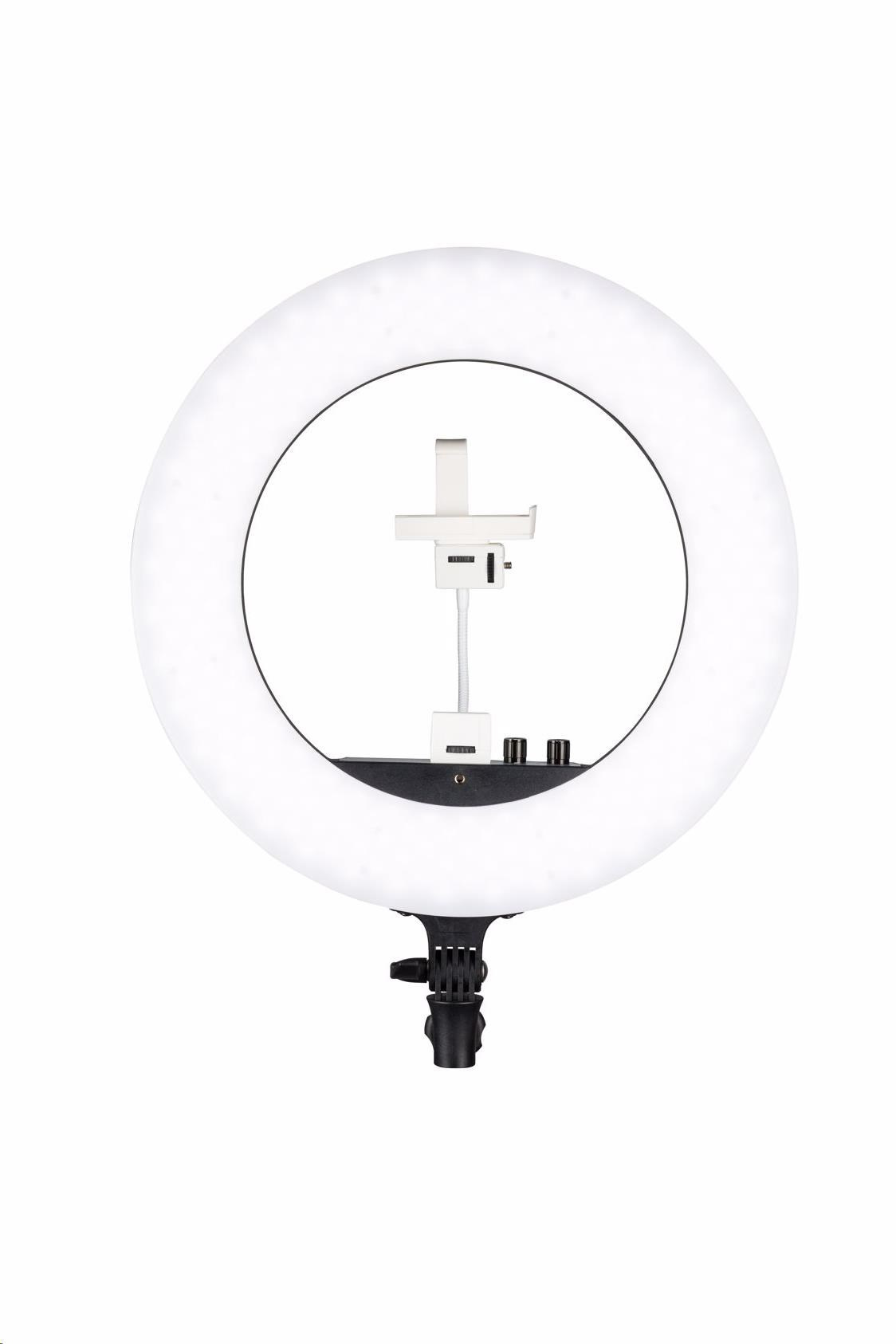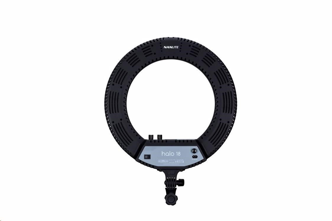 LED kruhové svetlo Halo 18 je možné napájať dodávaným sieťovým adaptérom. Vďaka štandardnému závitu 5/8" je možné kruhové svetlo namontovať na takmer akýkoľvek svetelný statív (nie je súčasťou balenia). Táto súprava obsahuje celý rad príslušenstva vrátane držiaka na mobilný telefón a obojstranného zrkadla na líčenie, z ktorých jedno je možné pripevniť priamo do stredu kruhového svetla.