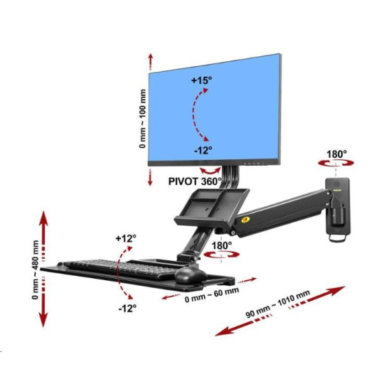 Kompletná špecifikácia Polohovateľná nástenná pracovná stanica NB MB32 Profesionálny držiak na monitor 19" - 27" a klávesnicu s myšou, odkladacia priehradka, otáčanie, naklon, výškové a dĺžkové nastavenie, VESA 75x75 a 100x100, nosnosť 9kg, najvyššia kvalita, systém vedenia káblov, výškové polohovanie 480mm Profesionálny držiak na monitor a klávesnicu, uchytenie na zvislú plochu (stena, pilier, stĺp, stroje a zariadenia). Polohovanie 3D - otáčanie do strán, naklon monitora, vysúvanie a zasúvanie od steny, výškové polohovanie (bez použitia náradia - dotykové), rotácia monitora (otočenie na šírku alebo na výšku). Držiak je vhodný na zavesenie všetkých typov monitorov a All in One PC s uhlopriečkou 19" až 27" a hmotnosťou 2-9kg. Police na klávesnicu a myš s rozmermi 560x200mm (možnosť zatvoriť) a priehradka na dokumenty, vizitky, mobil a poznámky. Najvyššia kvalita spracovania, jednoduchá inštalácia a nastavenie. Systém skrytého vedenia káblov. Farebné prevedenie čierne. Držiak na monitor alebo All in One PC vrátane police na klávesnicu a myš, 3D polohovanie, profesionálny, do kancelárie, výrobných hál, na stojany CNC a obrábacie stroje, uchytenie na zvislú plochu alebo stenu - NB MB32 Technické údaje: nastaviteľná nosnosť podľa hmotnosti monitora 2kg až 9kg na monitory a All in One PC s uhlopriečkou 19" až 27" podpora VESA štandardu 75x75 a 100x100 police na klávesnicu a myš s rozmermi 560mm x 200mm (možnosť zatvoriť, dĺžková regulácia 60mm) priehradka na dokumenty, vizitky, poznámky, bločky, mobilný telefón otáčanie do strán +/- 90° naklon obrazovky +12° / -12° výškové nastavenie samotnej obrazovky 100mm výškové polohovanie celého držiaka 480mm rotácia obrazovky PIVOT - otočenie do vodorovnej alebo zvislej polohy vzdialenosť od steny 90mm až 1010mm plynová pružina pre výškové polohovanie bez použitia náradia (dotykové) systém na vedenie káblov materiál hliník, kryty plastové najvyššia kvalita farebné prevedenie čierne záruka 3 roky Držiak All in One PC alebo monitora s policou na klávesnicu a myš, uchytenie na stenu alebo zvislú plochu, ideálny do výroby, na stroje, CNC, obrábacie stroje, do malých miestností atď. - NB MB32 Držiak na monitor NB MB32 podporuje VESA štandardy: VESA 75x75 VESA 100x100 3D polohovateľný držiak na monitor All in One PC a klávesnicu, uchytenie na stenu alebo zvislú plochu NB MB32 Nastavenie výšky bez použitia náradia, ľahko a rýchlo: Držiak má integrovaný plynový piest, ktorý po zavesení monitora otočením imbusového kľúča nastavíte na jeho hmotnosť. Potom bude držák vždy v takej výške, do ktorej ho zatlačením na monitor alebo vytlačením nastavíte. Regulácia výšky je možná v rozmedzí 480mm. Ergonomická kancelária, držiak monitora a klávesnice s myšou NB MB32 Kde možno použiť držiak monitora alebo All in One PC s policou na klávesnicu a myš: firmy, spoločnosti v kanceláriách malé miestnosti, práca bez stola (možnosť rýchleho nastavenia pre prácu v sedení alebo v stoji) v dielňach v továrňach pozície na strojoch (CNC, obrábacie atď.) v skladoch v domácnostiach