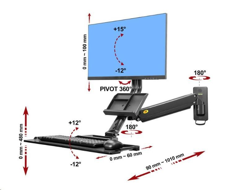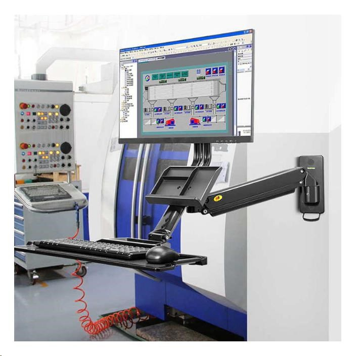 Kompletná špecifikácia Polohovateľná nástenná pracovná stanica NB MB32 Profesionálny držiak na monitor 19" - 27" a klávesnicu s myšou, odkladacia priehradka, otáčanie, naklon, výškové a dĺžkové nastavenie, VESA 75x75 a 100x100, nosnosť 9kg, najvyššia kvalita, systém vedenia káblov, výškové polohovanie 480mm Profesionálny držiak na monitor a klávesnicu, uchytenie na zvislú plochu (stena, pilier, stĺp, stroje a zariadenia). Polohovanie 3D - otáčanie do strán, naklon monitora, vysúvanie a zasúvanie od steny, výškové polohovanie (bez použitia náradia - dotykové), rotácia monitora (otočenie na šírku alebo na výšku). Držiak je vhodný na zavesenie všetkých typov monitorov a All in One PC s uhlopriečkou 19" až 27" a hmotnosťou 2-9kg. Police na klávesnicu a myš s rozmermi 560x200mm (možnosť zatvoriť) a priehradka na dokumenty, vizitky, mobil a poznámky. Najvyššia kvalita spracovania, jednoduchá inštalácia a nastavenie. Systém skrytého vedenia káblov. Farebné prevedenie čierne. Držiak na monitor alebo All in One PC vrátane police na klávesnicu a myš, 3D polohovanie, profesionálny, do kancelárie, výrobných hál, na stojany CNC a obrábacie stroje, uchytenie na zvislú plochu alebo stenu - NB MB32 Technické údaje: nastaviteľná nosnosť podľa hmotnosti monitora 2kg až 9kg na monitory a All in One PC s uhlopriečkou 19" až 27" podpora VESA štandardu 75x75 a 100x100 police na klávesnicu a myš s rozmermi 560mm x 200mm (možnosť zatvoriť, dĺžková regulácia 60mm) priehradka na dokumenty, vizitky, poznámky, bločky, mobilný telefón otáčanie do strán +/- 90° naklon obrazovky +12° / -12° výškové nastavenie samotnej obrazovky 100mm výškové polohovanie celého držiaka 480mm rotácia obrazovky PIVOT - otočenie do vodorovnej alebo zvislej polohy vzdialenosť od steny 90mm až 1010mm plynová pružina pre výškové polohovanie bez použitia náradia (dotykové) systém na vedenie káblov materiál hliník, kryty plastové najvyššia kvalita farebné prevedenie čierne záruka 3 roky Držiak All in One PC alebo monitora s policou na klávesnicu a myš, uchytenie na stenu alebo zvislú plochu, ideálny do výroby, na stroje, CNC, obrábacie stroje, do malých miestností atď. - NB MB32 Držiak na monitor NB MB32 podporuje VESA štandardy: VESA 75x75 VESA 100x100 3D polohovateľný držiak na monitor All in One PC a klávesnicu, uchytenie na stenu alebo zvislú plochu NB MB32 Nastavenie výšky bez použitia náradia, ľahko a rýchlo: Držiak má integrovaný plynový piest, ktorý po zavesení monitora otočením imbusového kľúča nastavíte na jeho hmotnosť. Potom bude držák vždy v takej výške, do ktorej ho zatlačením na monitor alebo vytlačením nastavíte. Regulácia výšky je možná v rozmedzí 480mm. Ergonomická kancelária, držiak monitora a klávesnice s myšou NB MB32 Kde možno použiť držiak monitora alebo All in One PC s policou na klávesnicu a myš: firmy, spoločnosti v kanceláriách malé miestnosti, práca bez stola (možnosť rýchleho nastavenia pre prácu v sedení alebo v stoji) v dielňach v továrňach pozície na strojoch (CNC, obrábacie atď.) v skladoch v domácnostiach